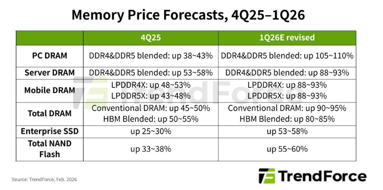 Trend Force最新调查显示,受AI服务器与数据中心扩张影响,2026年Q1全球内存与闪存供需失衡加剧,上游供应商议价能力提升。基于此,Trend Force将2026年传统DRAM合约价涨幅预测从55%–60%上调至90%–95%,NAND闪存从33%–38%上调至55%–60%,涨幅远超市场预期。